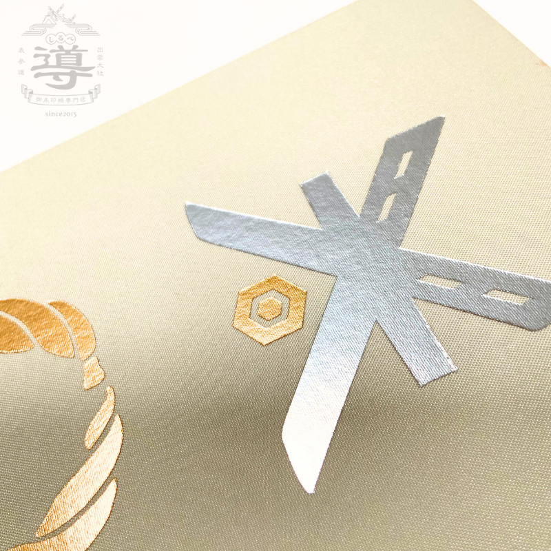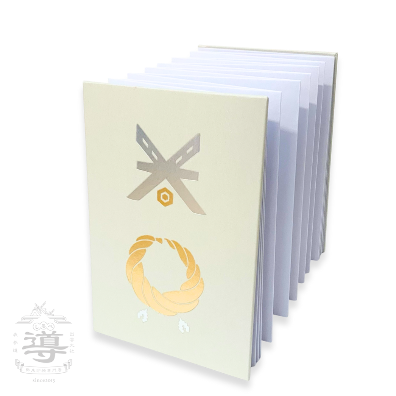 光沢のある優しいクリーム色の生地が、金銀色の箔押しを包込み、穏やかな色味の生地と金銀箔の柔らかなコントラストを生み出した御朱印帳。