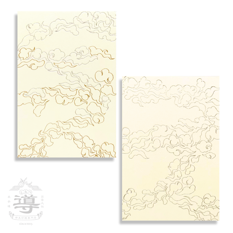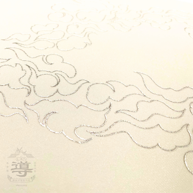 雲は、金と銀の二色の箔を用いて雅やかに描かれ、淡いクリーム色のサテン風生地に浮かび上がります。