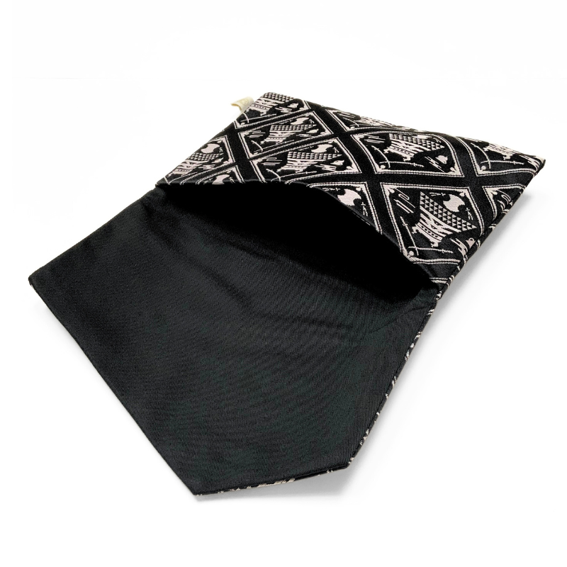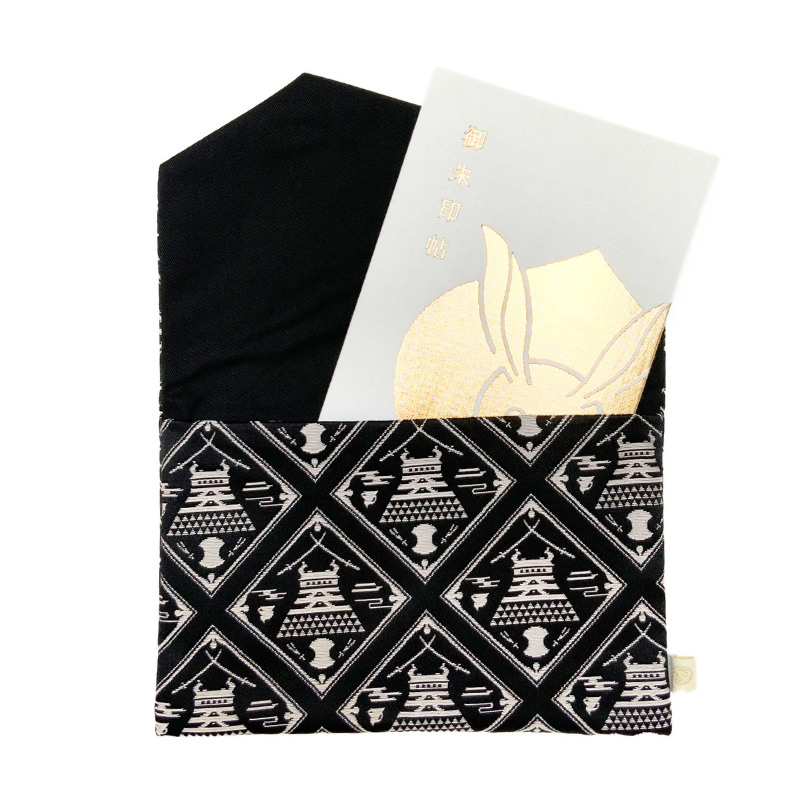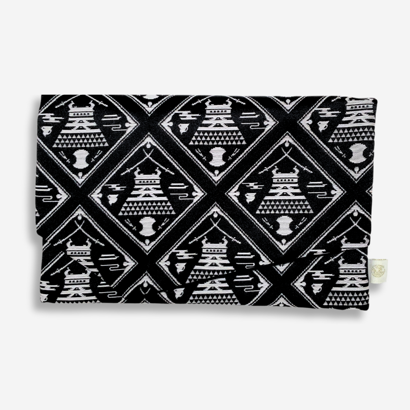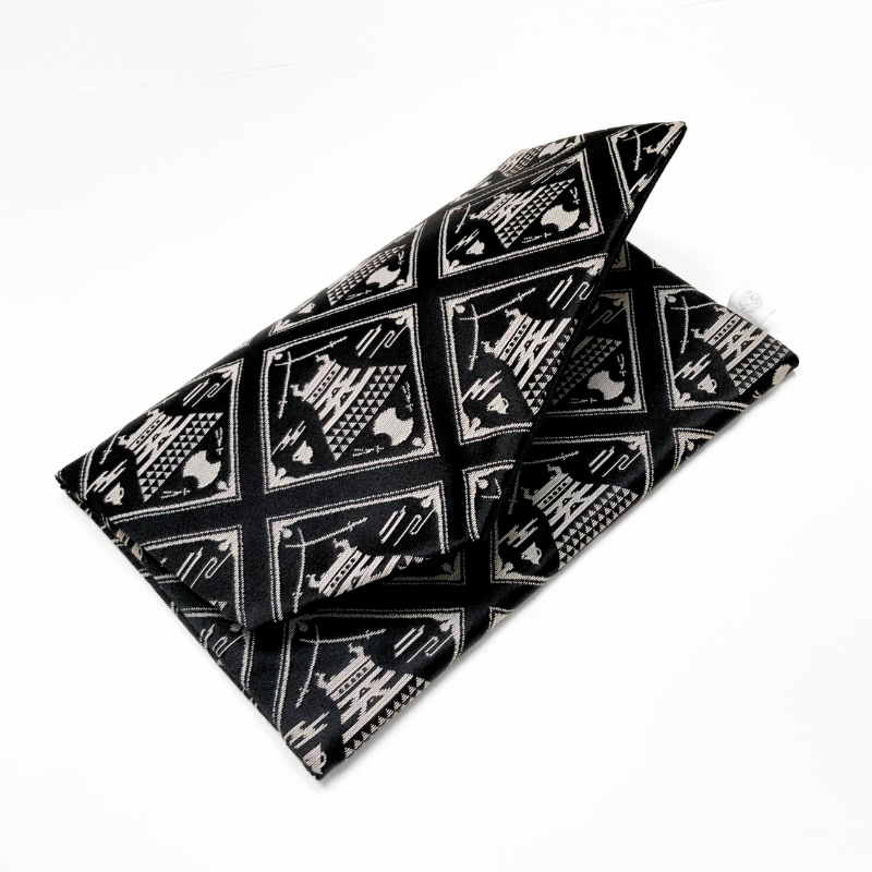 Against a dignified black background stands a refined composition of Japanese motifs centered around Matsue Castle, a National Treasure. Pine needles, bundoumon (weight-shaped crests), plovers, and swords—each symbolizing the history and culture of Matsue—are arranged in a symmetrical, sophisticated layout. Though rendered in a calm monotone palette, the intricate weave adds depth, creating a sense of stately elegance. An item that serves beautifully as a fukusa or a case for your goshuincho (temple and shrine stamp book), it’s perfect for adding refined charm to many occasions.